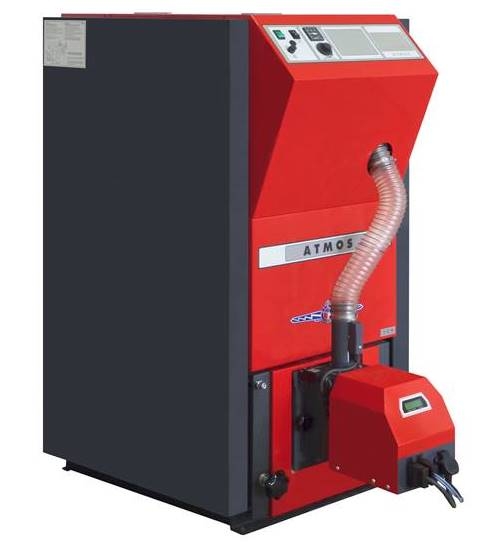 Aus dem integrierten Silo transportiert und dosiert eine innenliegende Förderschnecke die Pellets zu dem unten frontseitig angebrachten ATMOS A25PX Pelletbrenner. Dieser unterscheidet sich in verschiedenen Details zu den sonst verwendeten und seit 2010 von Atmos selbst produzierten A25 Pelletbrenner. So ist beispielsweise das Füllrohr gerade und nicht wie sonst gewinkelt ausgeführt und auch die Software unterscheidet sich in verschiedenen Grundparametern von der Standardausführung. Ansonsten ist der Pelletbrenner aber analog zu den anderen A25 – A25GSP – A45 und A85 Brennern einzustellen. Ein großer Vorteil den ATMOS dabei bietet, denn der Installateur kennt sich sofort an jedem unserer Brenner aus, sobald er nur einen kennt.